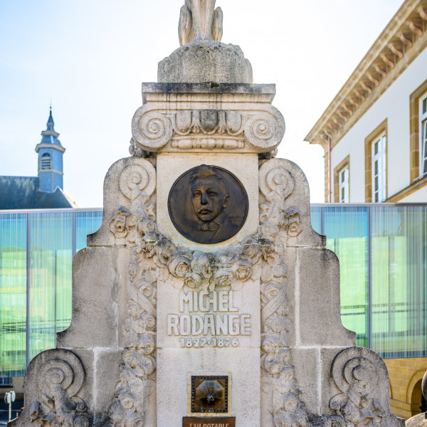 Rodange ist vor allem für sein Werk Renert bekannt, eine luxemburgische Fabel, die auf dem Epos von Goethe basiert. Das Denkmal, enthüllt 1956, zeigt Rodange in nachdenklicher Pose, gekrönt von einer Figur aus seinem berühmten Werk: der listige Fuchs Renert. Es symbolisiert die Bedeutung von Rodanges Beitrag zur luxemburgischen Literatur und Kultur.