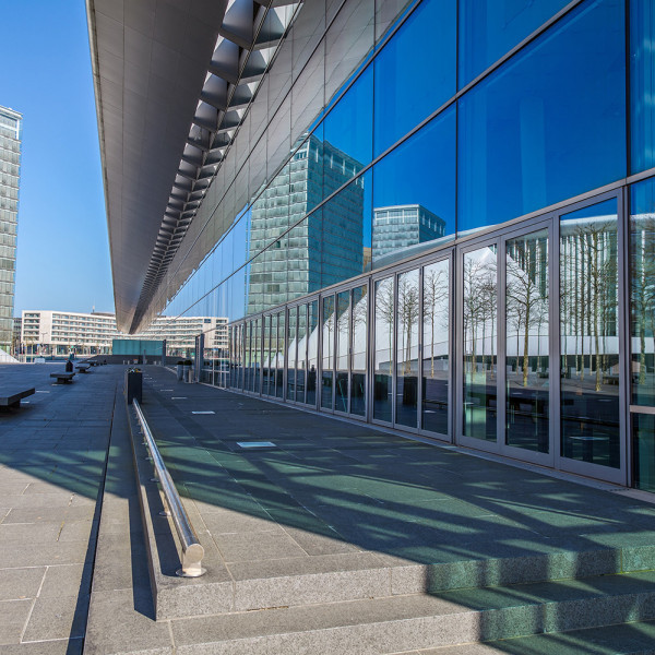 Die vollständig verglaste Fassade, die von einem 300 Meter langen Vordach gekrönt wird, umschließt den unteren Teil des Turmes über drei Etagen.