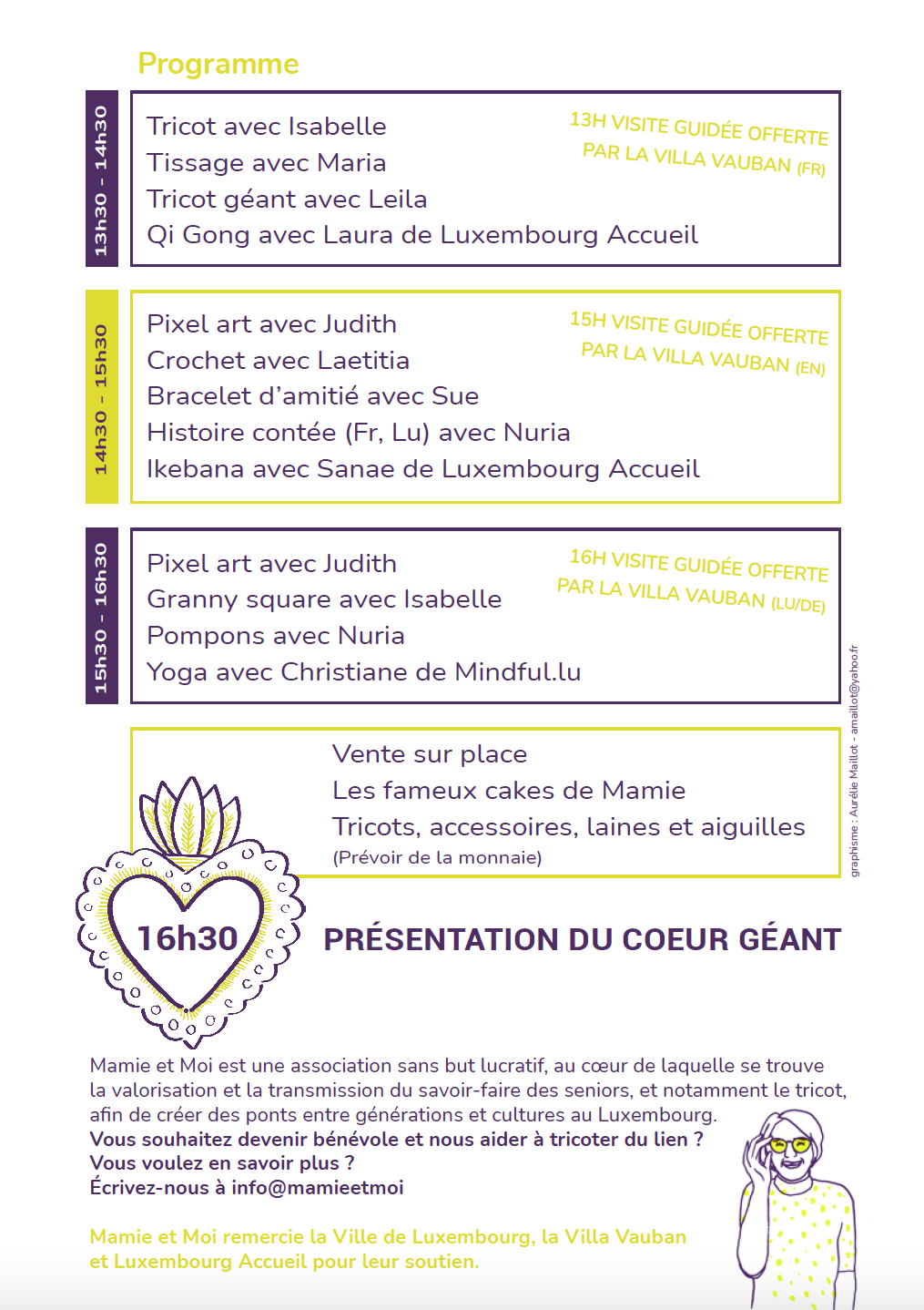 Vor Ort können Sie Kuchenstücke kaufen, die von ehrenamtlichen Großmüttern gebacken wurden, sowie Strickwaren aus den Kollektionen von Mamie et Moi, aber auch Zubehör und Material (Wolle, Nadeln usw.). Die gesammelten Gelder werden verwendet, um zukünftige Projekte von Mamie et Moi zu finanzieren.