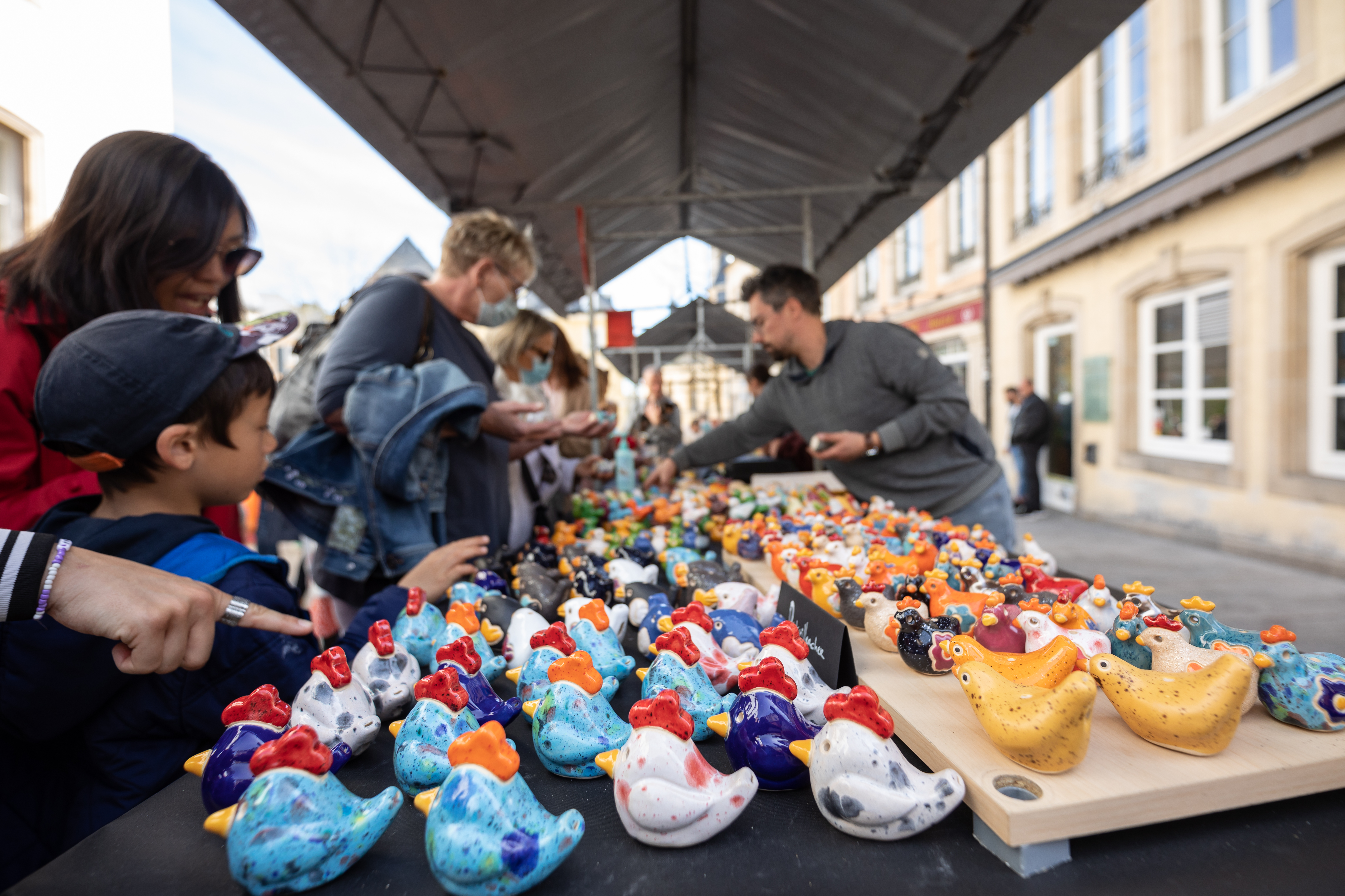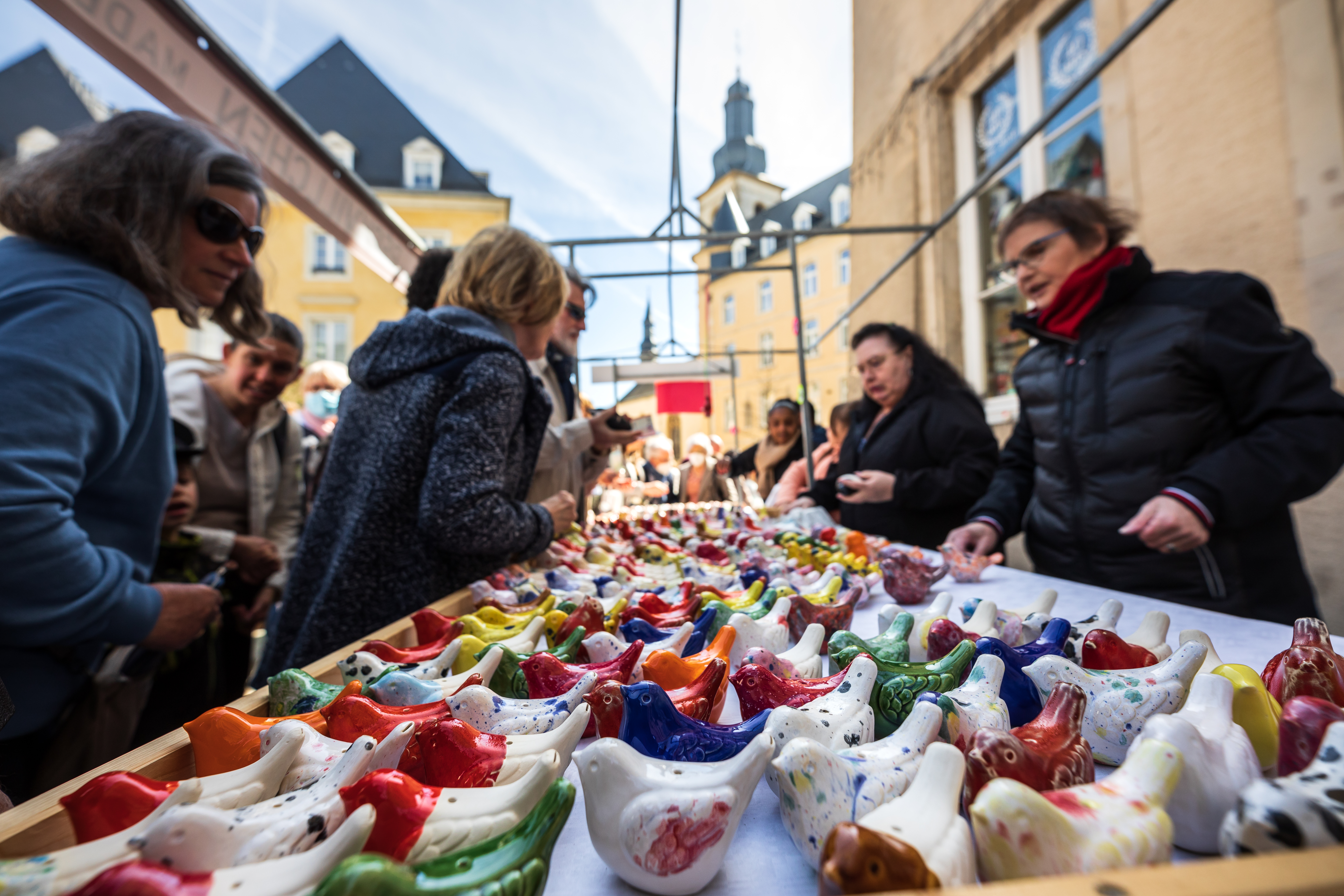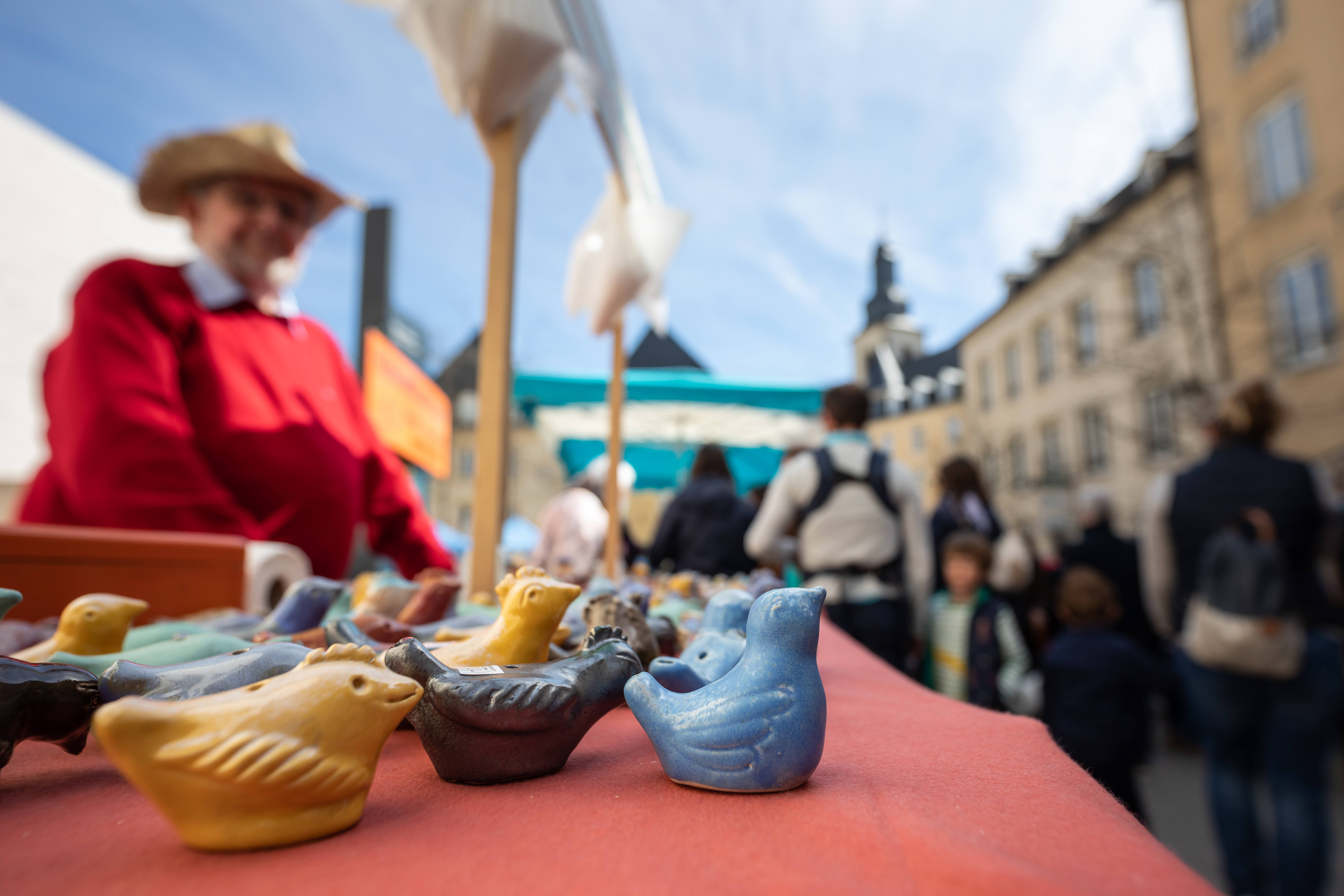 Wie jedes Jahr läutet das Osterfest die Ankunft des Kunsthandwerkermarktes "Éimaischen" ein, einer der symbolträchtigsten Veranstaltungen der luxemburgischen Tradition, die seit mindestens 1827 besteht und sich auf Töpferwaren und Keramik konzentriert. Dazu gehören die berühmten "Péckvillercher", kleine vogelförmige Tonpfeifen, die ausschließlich auf der Éimaischen verkauft werden. Ihr Aussehen variiert von Jahr zu Jahr und macht sie zu begehrten Sammlerobjekten, um die sich die Sammler schon in der Morgendämmerung scharen. Ihre Klänge tragen zusammen mit der volkstümlichen Unterhaltung und den Essensständen zu der besonderen Atmosphäre dieses einzigartigen Marktes bei.