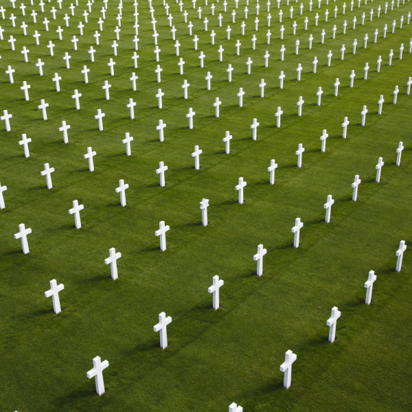 The white crosses of the 5,076 graves form an arch in front of a memorial chapel.