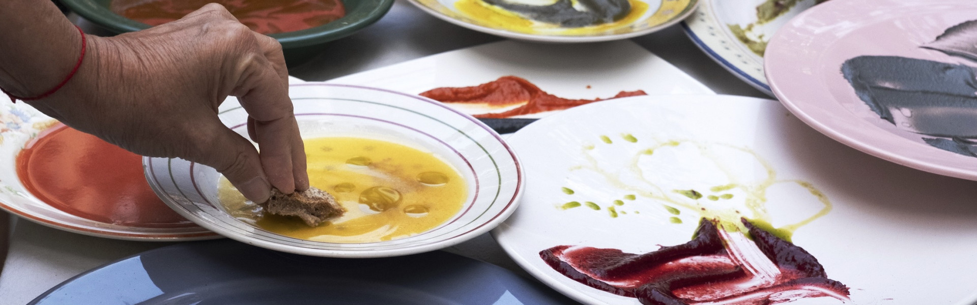 “Fare la scarpetta," Italian for "making the little shoe," is a gesture made after eating a delicious dish. The bread dances on the surface of the plate, improvising its walk and picking up the best parts of the meal. It's a gesture of appreciation but also a pictorial event.