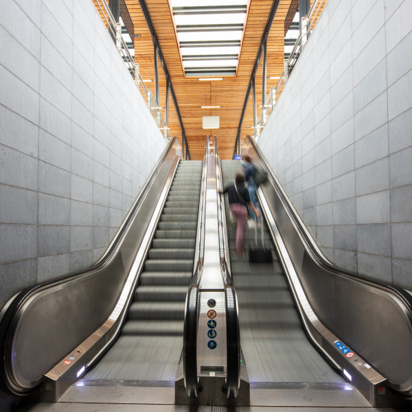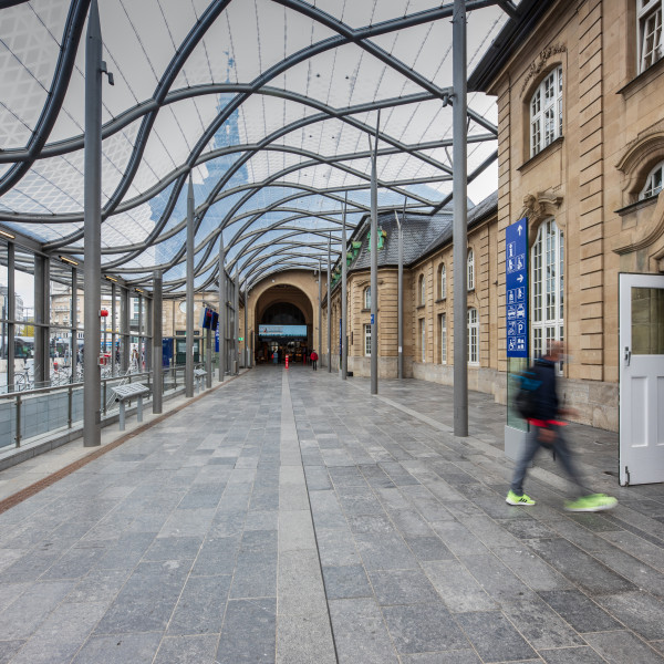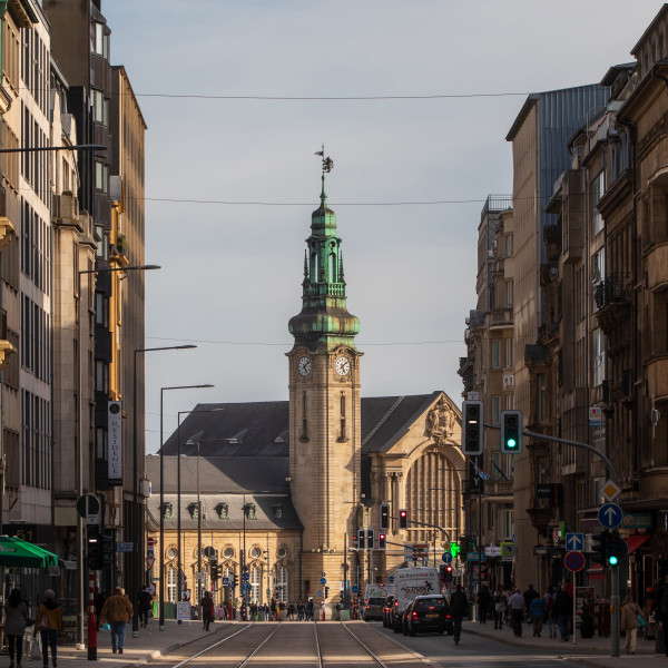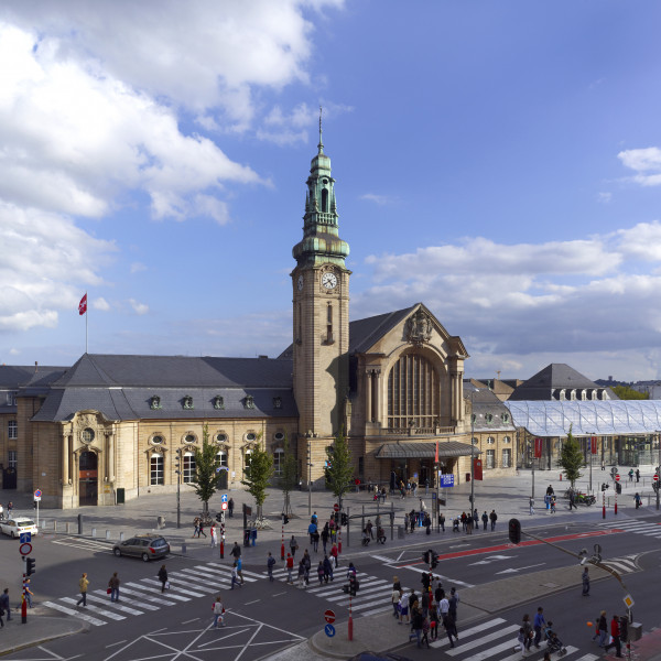 In the entrance hall a mosaic window discloses the outline of the city; the ceiling was repainted by the Luxembourg artist Armand Strainchamps.