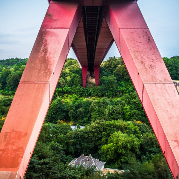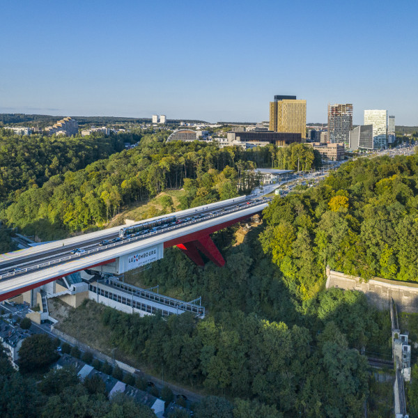 The “Red Bridge” – in the vernacular – connects the city centre to the European quarter on the Kirchberg Plateau, crossing the Pfaffenthal 74 metres above the Alzette. It is 355 metres long, the clear span between the pillars is 234 metres, the width 25 metres and the total weight 4,900 tons.