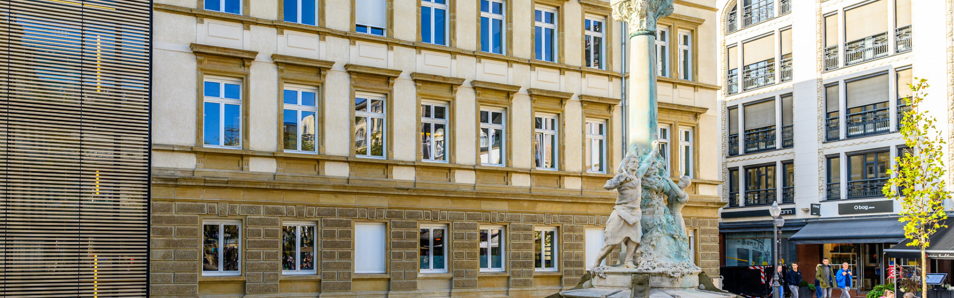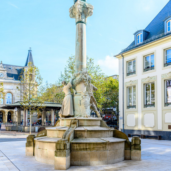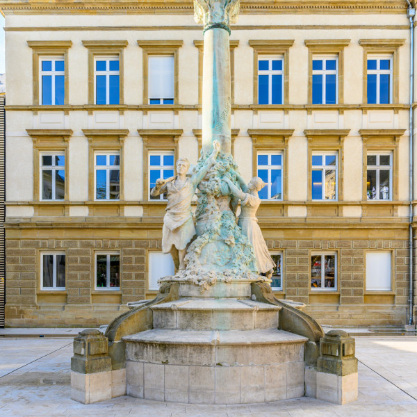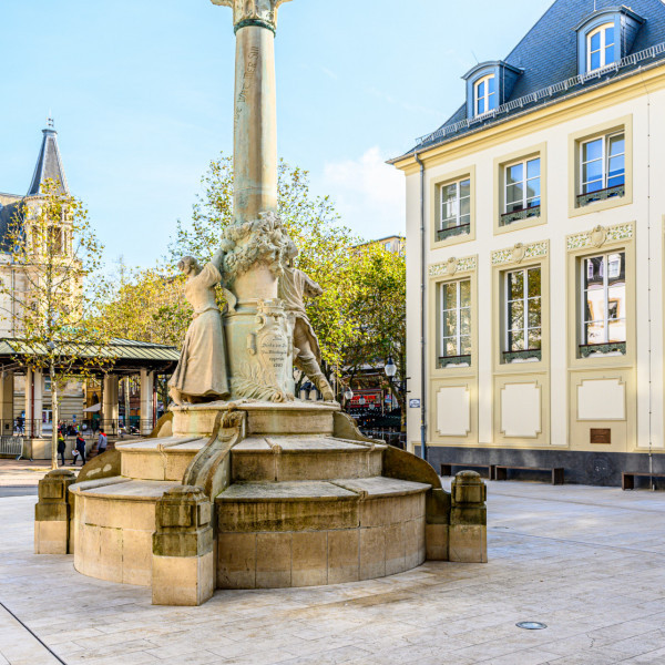 The monument is topped by a lion, the heraldic animal of the Grand Duchy, while the blacksmith incarnates the steel industry. The pillar contains a chiselled inscription, the wording of which is the motto of the Luxembourgers: “Mir wëlle bleiwe wat mir sin” (we want to remain what we are).