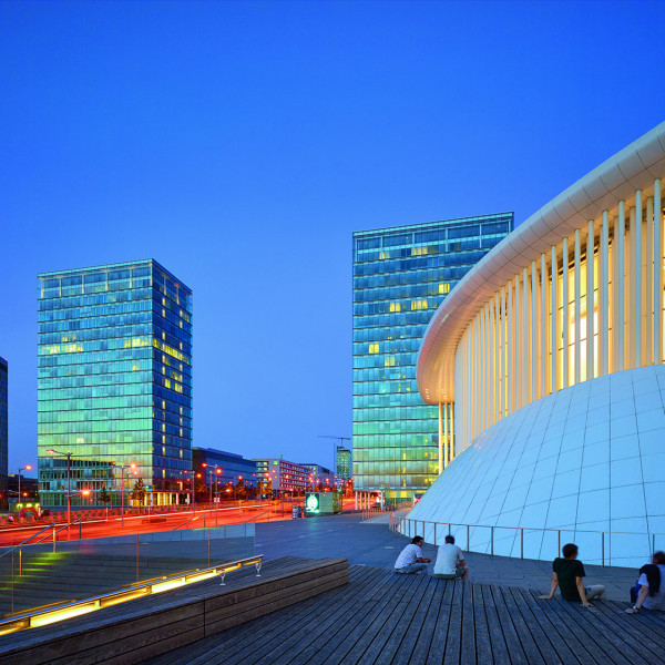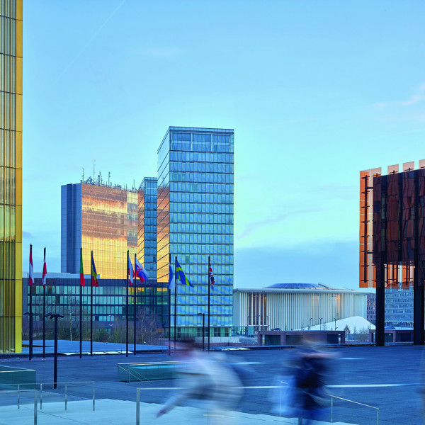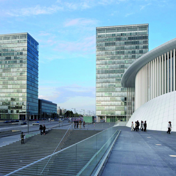 Main buildings on the Place de l'Europe: Philharmonie, Alcide De Gasperi Building, New Conference Center, MUDAM and Musée Dräi Eechelen - fortress, history and identities.