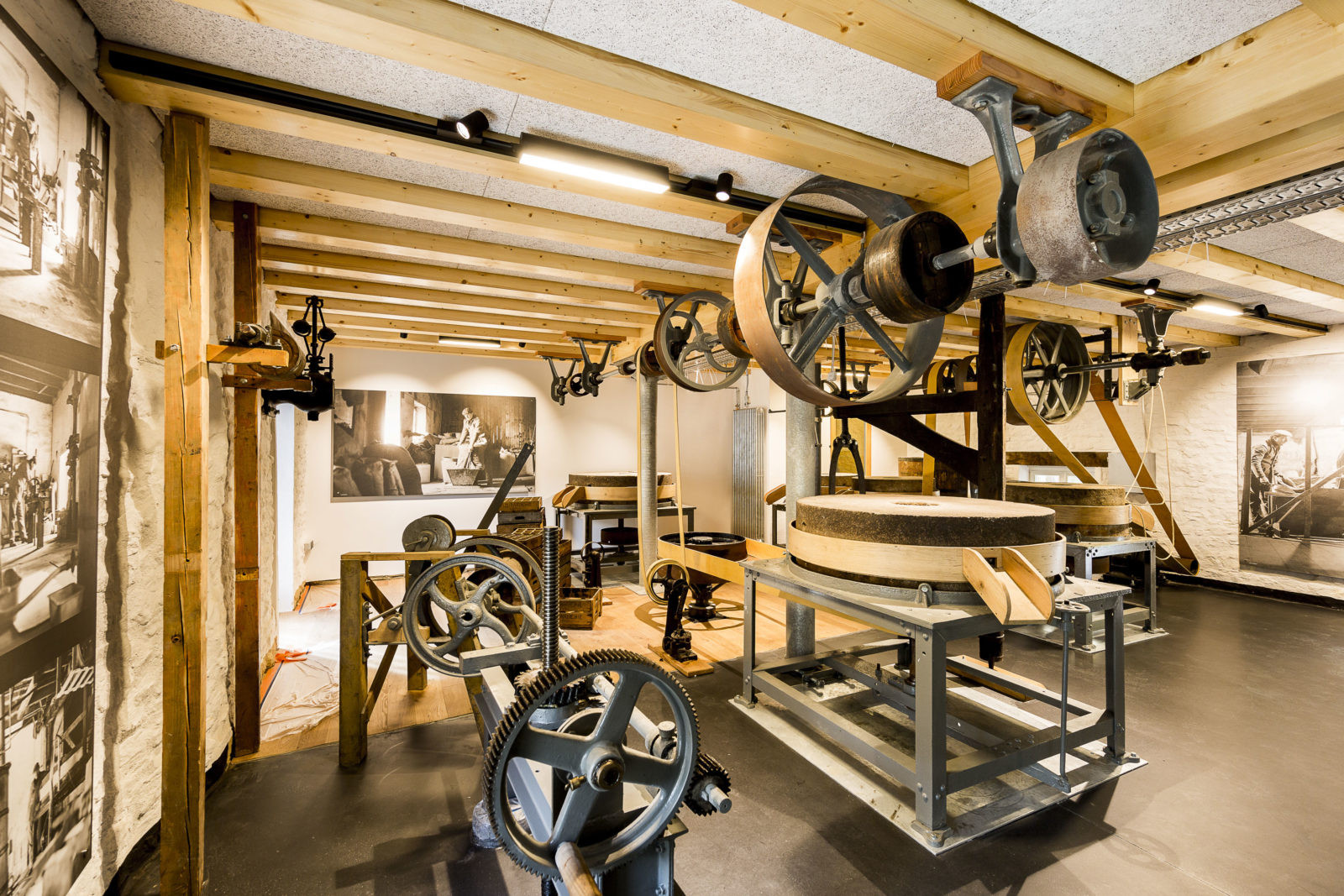 The visitor discovers the large water wheel rotating in the canal as well as the first floor where grinding was once carried out with the old millstones and gears. A historical film illustrates the opertion of the mill and the production of mustard. A separate space is reserved for workshops.
