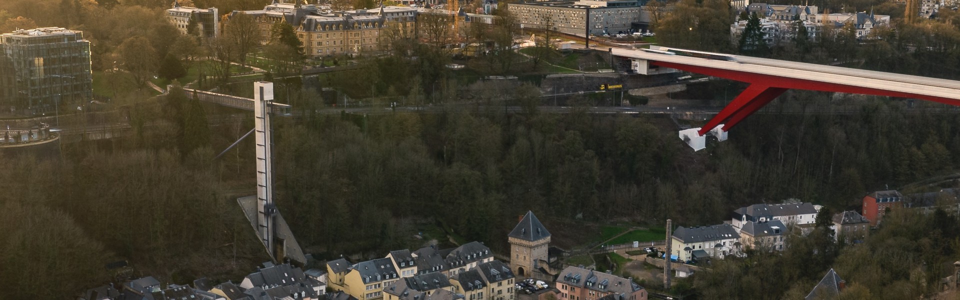 The “Red Bridge” – in the vernacular – connects the city centre to the European quarter on the Kirchberg Plateau, crossing the Pfaffenthal 74 metres above the Alzette. It is 355 metres long, the clear...