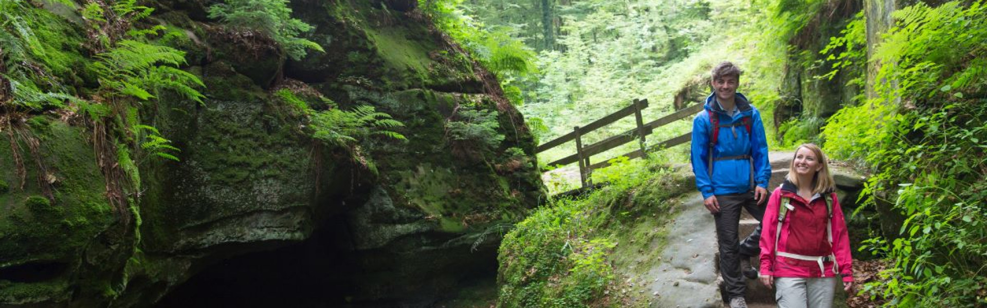 The waterfall, known as Schiessentümpel, with its three water jets on the Black Ernz is one of the most photographed motives of the Mullerthal Region, Luxembourg’s Little Switzerland. This is a 45-minute walking tour. Please make sure to wear comfortable hiking shoes, especially at the Schiessentümpel waterfall.