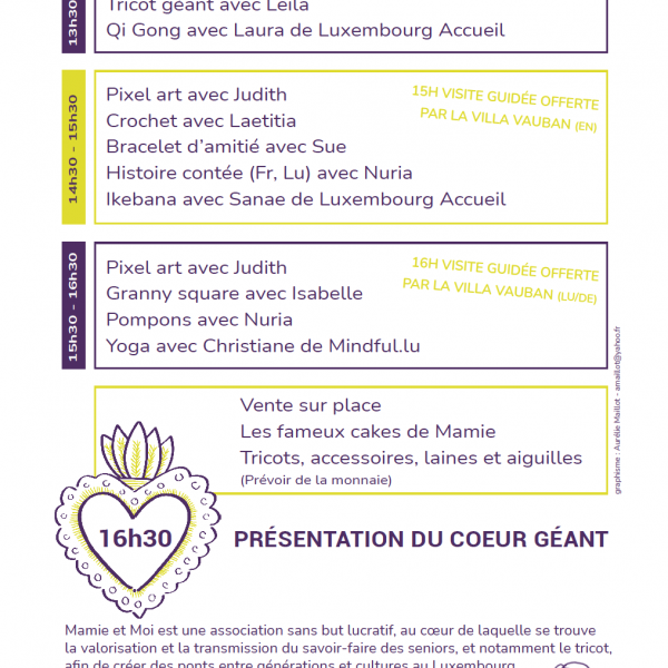 On-site, you will be able to purchase slices of cakes baked by volunteer grandmothers as well as knitted items from Mamie et Moi's collections, along with accessories and materials (yarns, needles, etc.). The funds raised will be used to finance future projects of Mamie et Moi.