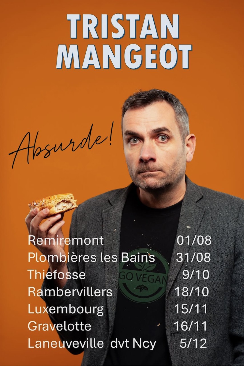 Tristan Mangeot, plusieurs fois primé au Clou’s Up à Nancy et membre du duo Les Tantans , présentera son premier spectacle Absurde ! Il évoquera son demi-siècle de vie, de manière décalée et absurde. De son expérience de rouler en voiture électrique, d’être devenu végétarien à sa peur de vieillir, vous saurez tout ou presque de sa vie.