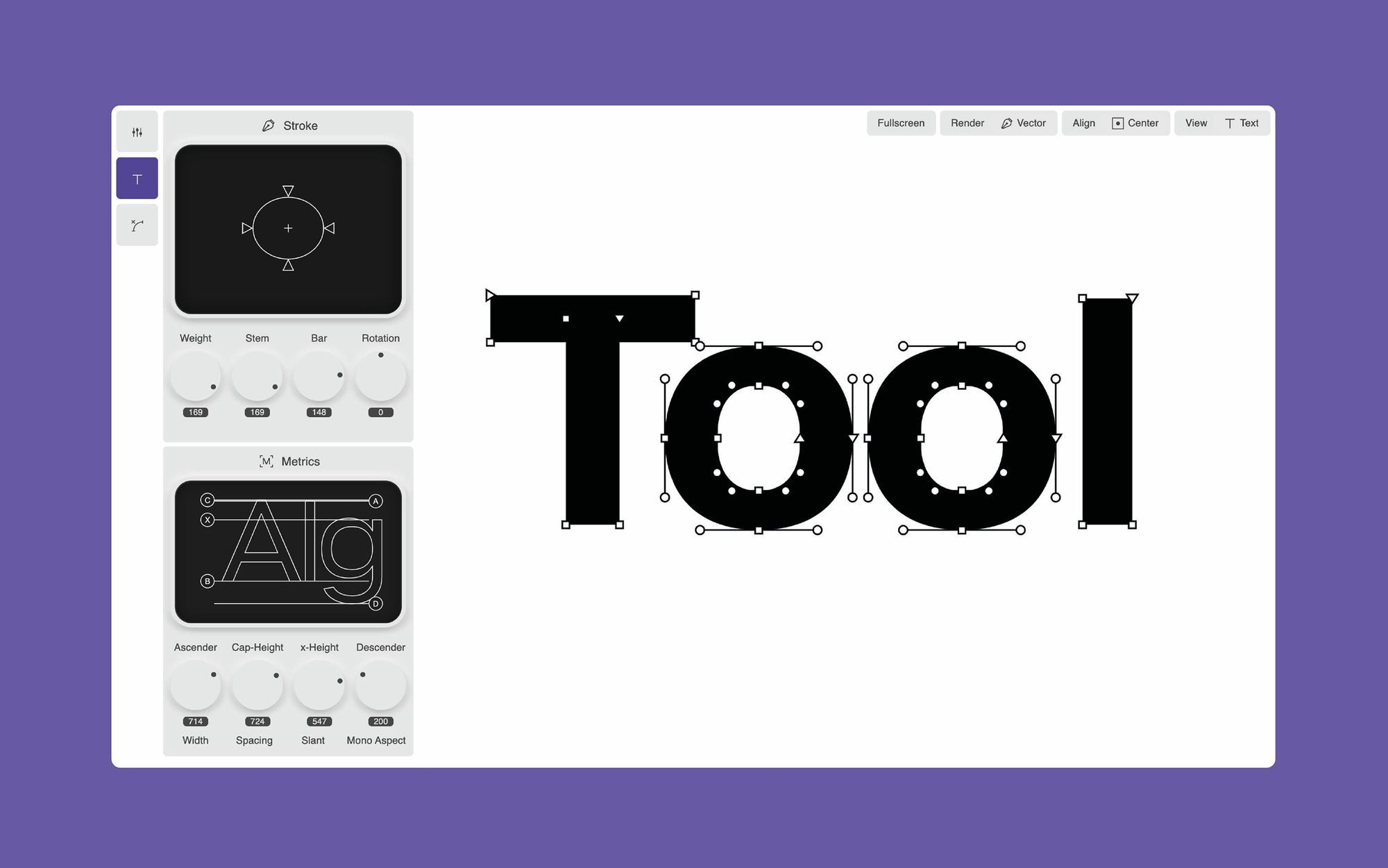 Burrowlab is parametrically driven type design software, conceptualised and developed by Philipp Koller, which systematises and reimagines the process of creating typefaces. While digital type design has always involved some degree of manufacturing, Burrowlab formalises the complex rules behind letterforms into a dynamic framework of logic and constraints. Rather than manually drawing paths, users control buttons, sliders and settings while glyphs are generated in real time. Letterforms are defined not by fixed outlines, but by the fluid interplay of numerical parameters and calculations.