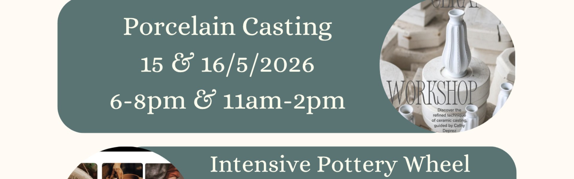 2. Porcelain Casting Workshop on May 15 & 16: Learn the art of mold-making and casting with beautiful porcelain.