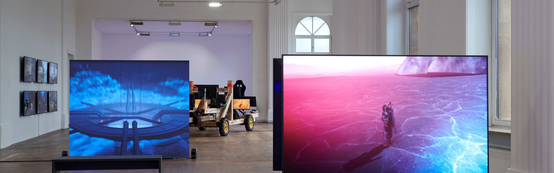 Photo: Razorade, Trash Fantasy, 2023 ; Emilija Škarnulytė, Rakhne, 2023 ; Theo Triantafyllidis, Feral Metaverse (Katapult MKII), 2025 ; Mélanie Courtinat, Ten Lands, 2020. Exhibition view of Screentime/s at Casino Luxembourg – Forum d’art contemporain, 2026 © Marc Domage