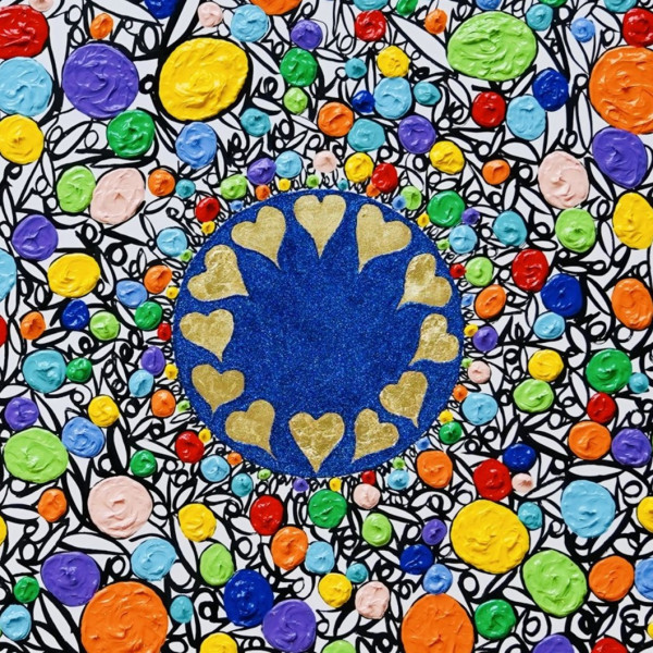 The exhibition features a collection of vibrant paintings, full of bright colors and repetitions of the word "love." Literally and figuratively, love oozes from these paintings.