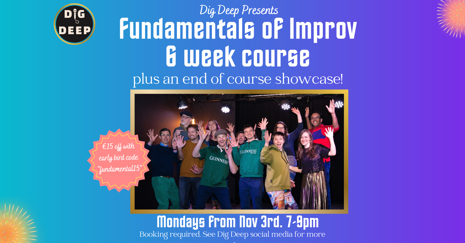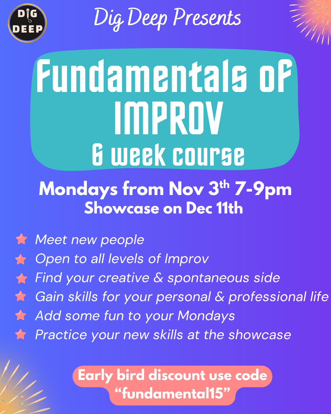 - Can I attend a Dig Deep event before the course? Yes! Check out out upcoming workshops and Jams where you can get a better sense of Improv and Dig Deep and meet some of the community