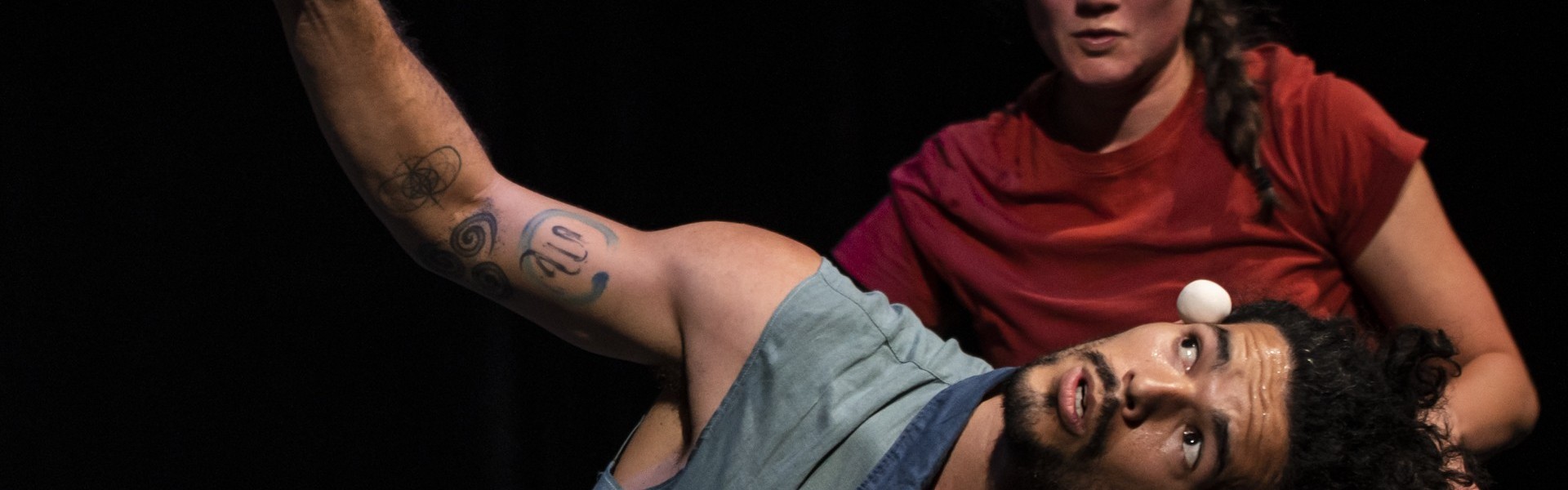 White balls – hundreds of them – bounce, roll, and fly across the stage. All slightly different, they cling to the ceiling, spill into the audience, even leap from the performers’ mouths. Two circus artists try in vain to contain the chaos, but the balls have a life of their own.
