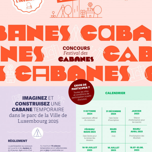 Le Festival des Cabanes. est un concours de construction et de créativité en architecture qui a été initié par le Service national de la jeunesse (SNJ) et l’Ordre des Architectes et Ingénieurs-conseils (OAI).Des groupes de jeunes entre 12 et 26 ans seront invités à développer et à construire un projet de cabane temporaire autour du thème « Rendre visible, l’invisible ». La 5e édition aura lieu dans le cadre de la LUGA 2025 – Luxembourg Urban Garden.