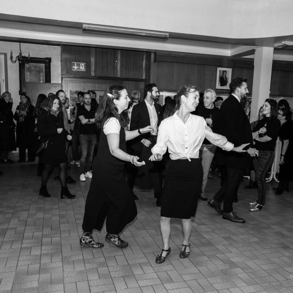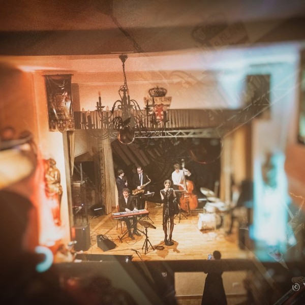 The venue Sang a Klang, with its historical façade and iconic balcony, offers a natural setting for jazz music and social dancing. The musicians perform from an elevated stage while dancers bring the dance floor to life below.