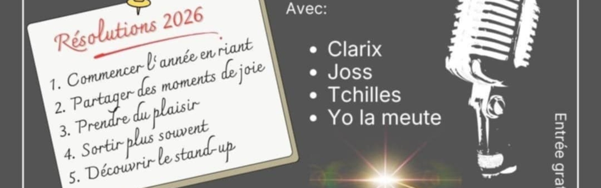 📋Au programme : 5 à 6 humoristes se succéderont sur scène pour vous offrir un stand-up authentique, dynamique et convivial.