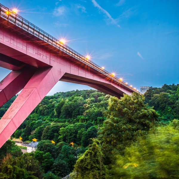 The “Red Bridge” – in the vernacular – connects the city centre to the European quarter on the Kirchberg Plateau, crossing the Pfaffenthal 74 metres above the Alzette. It is 355 metres long, the clear...