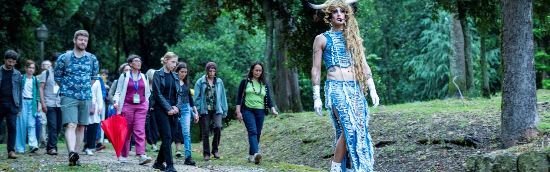 Bei Try Walking in my Hooves nimmt Soya the Cow, das alter Ego des Performancekünstlers Daniel Hellmann, das Publikum mit auf einen philosophischen Spaziergang durch die Stadt. Der Schwerpunkt liegt dabei bewusst auf der Präsenz nicht-menschlicher Körper: Hunde, die mit ihren Freund:innen spazieren gehen. Tauben, die ein Denkmal in ihre Toilette verwandelt haben. Soya the Cow lädt zu einem Perspektivenwechsel ein, der Sehgewohnheiten und Selbstverständnis in Frage stellt. Auf spielerische und musikalische Weise ruft sie zu einer Neukonstituierung der Beziehung zwischen Menschen und anderen Tieren auf, basierend auf unserer gemeinsamen Animalität.