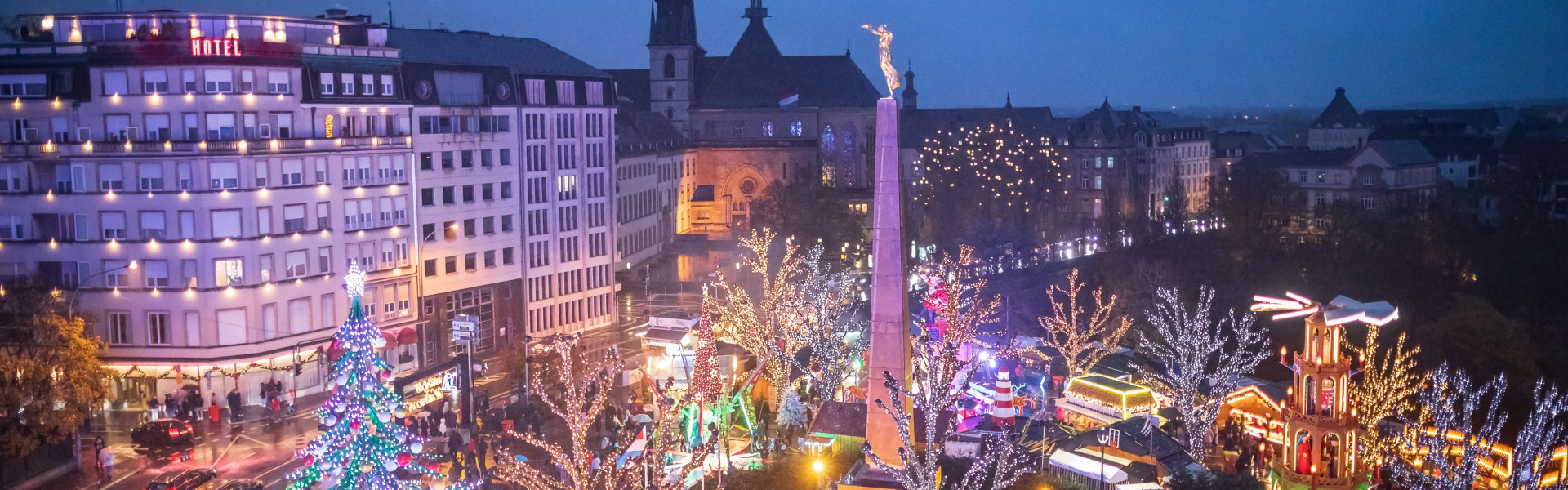 The Wantermaart at Place de la Constitution in Luxembourg City invites you to a vibrant winter and Christmas market right in the heart of the city: Set around the “Gëlle Fra” monument, you’ll discover beautifully crafted wooden chalets offering gift ideas, artisan crafts, decorations and culinary treats.