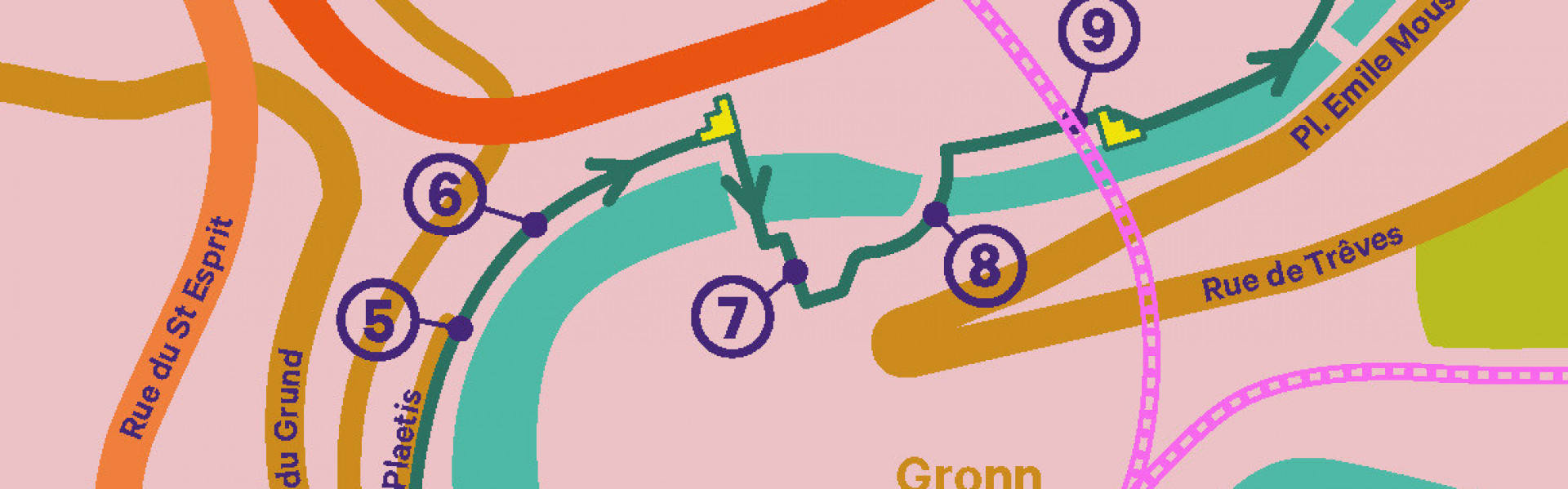 Bring headphones and phonesFollow the river Alzette through the Grund, Clausen and the Pfaffenthal with the Wou d’Uelzecht - Stad soundwalk. A sensory experience highlighting the unique soundscape of the river as well as its stories, and connecting it through artistic response in music and text to its historical significance and location. Available in 4 languages (LU, FR, DE, EN), it can be done any time, on your own or in a group and is suitable for all ages. The route is 2.7 km long and we suggest allowing around 2 hours, including the 13 audio tracks.Download or stream the audio for free onto your own device (phone, tablet) and follow the map. Pause at each number on the map to listen to the corresponding track. This is a 360º binaural recording: use headphones...