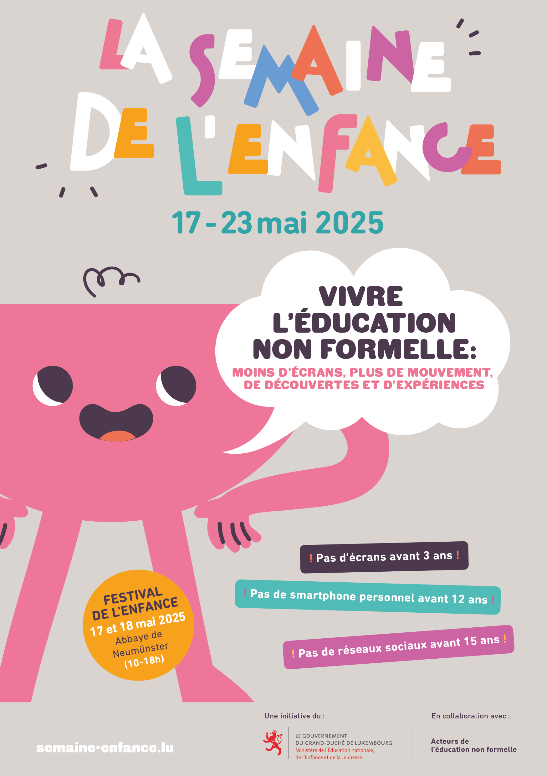 Organisé dans le cadre de la Semaine de l’enfance (17 au 23 mai 2025) par le ministère de l’Éducation nationale, de l’Enfance et de la Jeunesse, en collaboration avec les acteurs de l’éducation non formelle, le Festival de l’enfance vous invite à partager des moments uniques et enrichissants avec vos enfants.