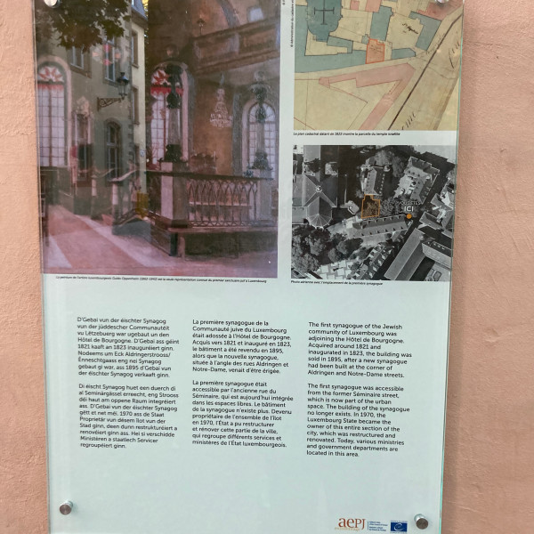 Une plaque commémorative dans la rue de la Congrégation, à proximité immédiate de l’Hôtel de Bourgogne qui a longtemps été le siège du Premier ministre luxembourgeois, rappelle la synagogue construite au début du 19e siècle et la renaissance à cette époque d’une communauté juive au Luxembourg. Le monument « Kaddish », érigé à quelques mètres de là en 2018, rappelle quant à lui son éradication par l'Allemagne nazie.