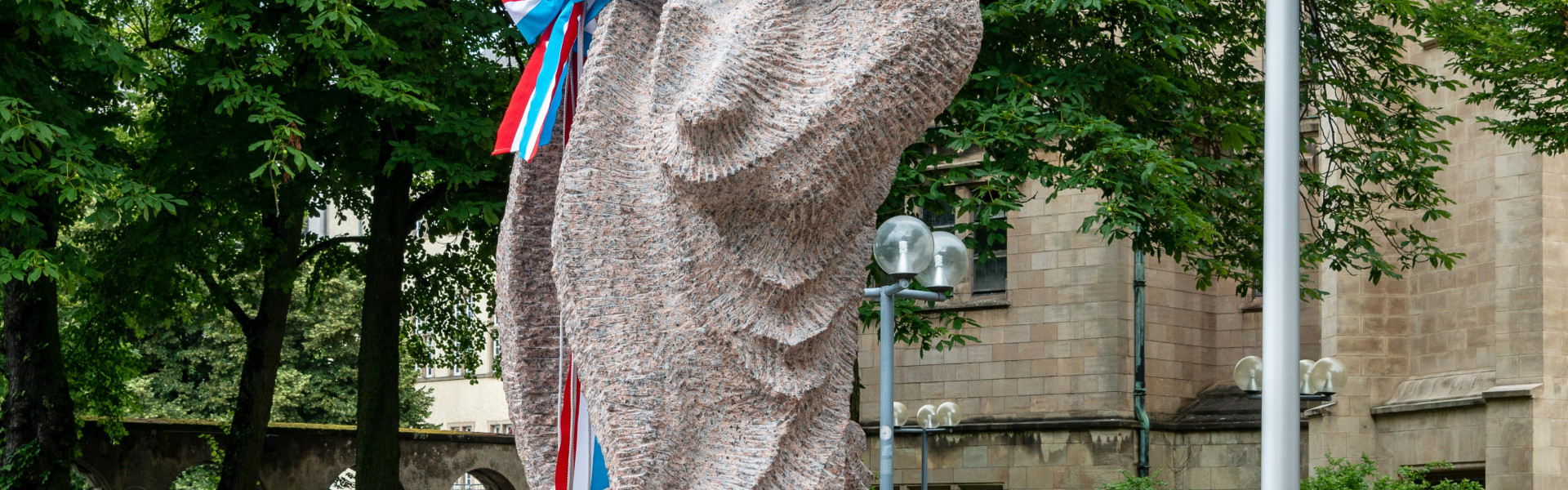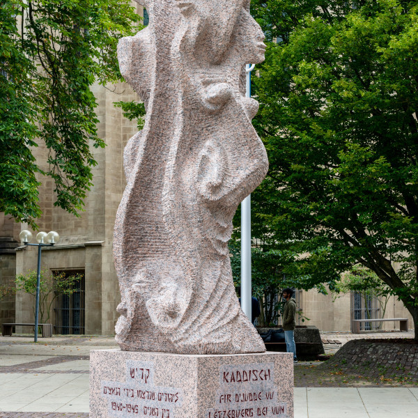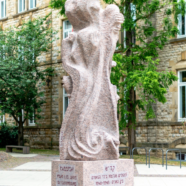 La sculpture en granit gris-rose a été conçue et réalisée par l’artiste franco-israélien Shelomo Selinger. Né en Pologne en 1928, Selinger a survécu à neuf camps de concentration et à deux marches de la mort. L’artiste parle de son œuvre en ces termes : « Le kaddish est une prière juive pour les morts, mais dans laquelle il n’y a pas un seul mot sur la mort. Je suis un laïc, un ancien déporté, fils d’un père et d’une mère assassinés par les nazis, tout comme ma petite sœur, toute ma famille et tout mon peuple. Je n’avais jamais fait de prière de kaddish auparavant et, grâce à ces pierres qui m’ont été confiées, j’ai pu graver ma prière de kaddish dans le granit avec un burin et un marteau. Pendant deux ans, j’ai prié, bien que je sois laïc et que je ne croie pas en l’existence de Dieu ». (Woxx, 21 juin 2018)