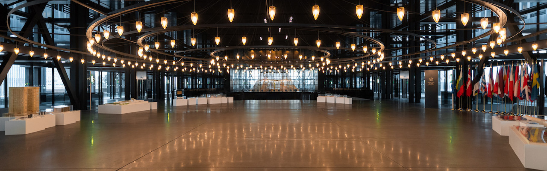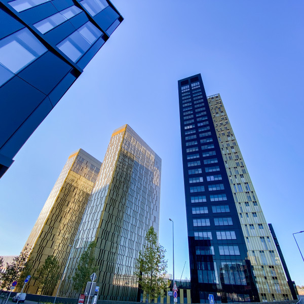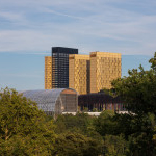 La Cour comporte également deux tours de 24 étages mordorles, aux façades en maille métallique, reliées à l'ensemble de l'institution par une galerie de liaison de service et bordant le grand parvis d'honneur.
