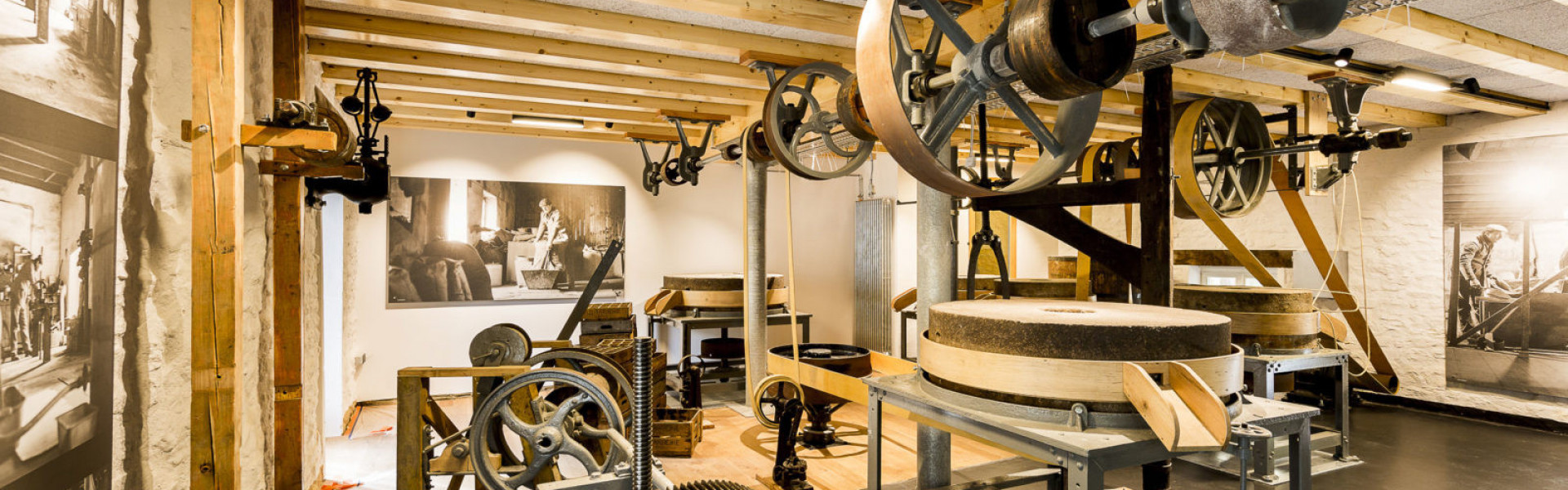 Le visiteur découvre la grande roue à eau dans son canal ainsi que la salle u premier étage où s'effectuait autrefois la moutarde avec engrenages et meules. Un film historique illustre le fonctionnement du moulin et la production de moutarde. Un espace particulier est réservé aux ateliers pratiques.