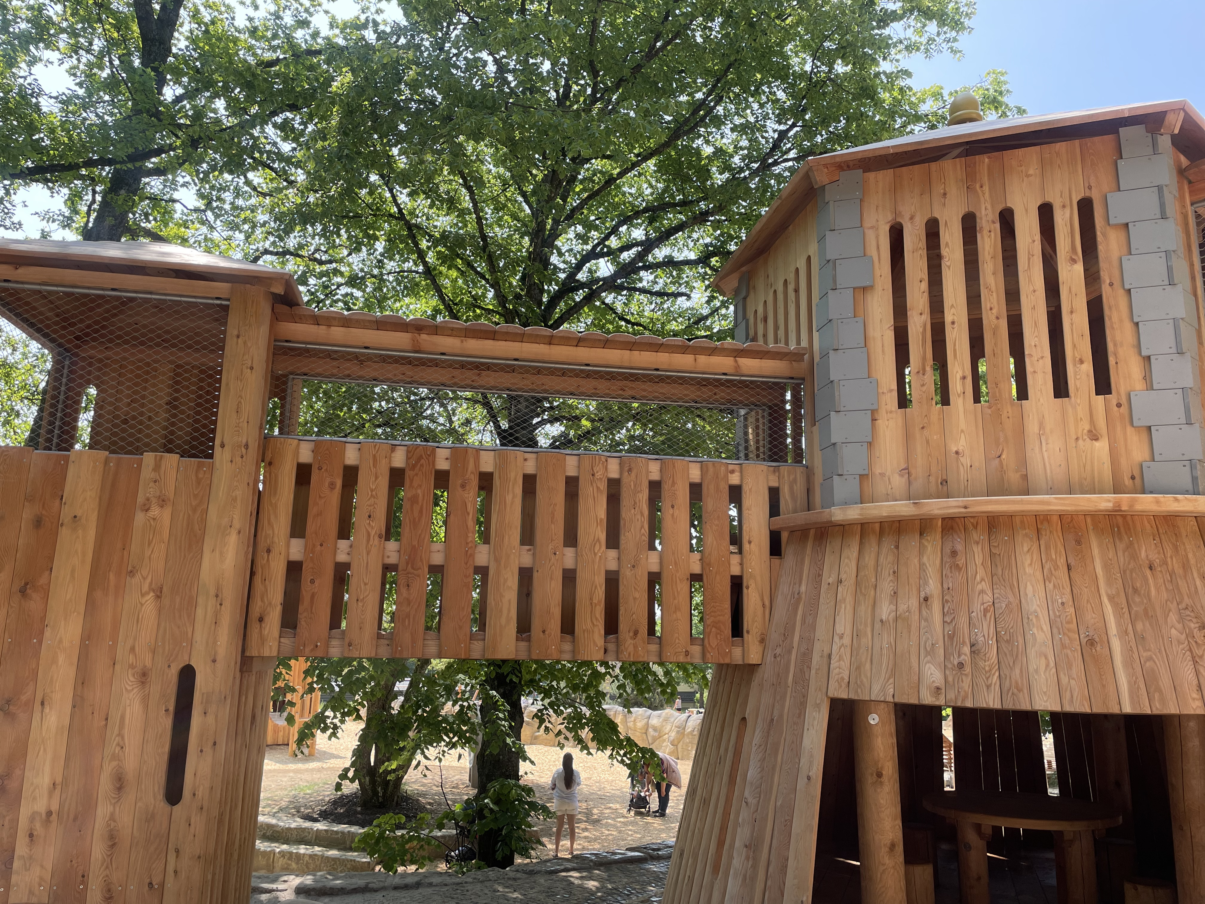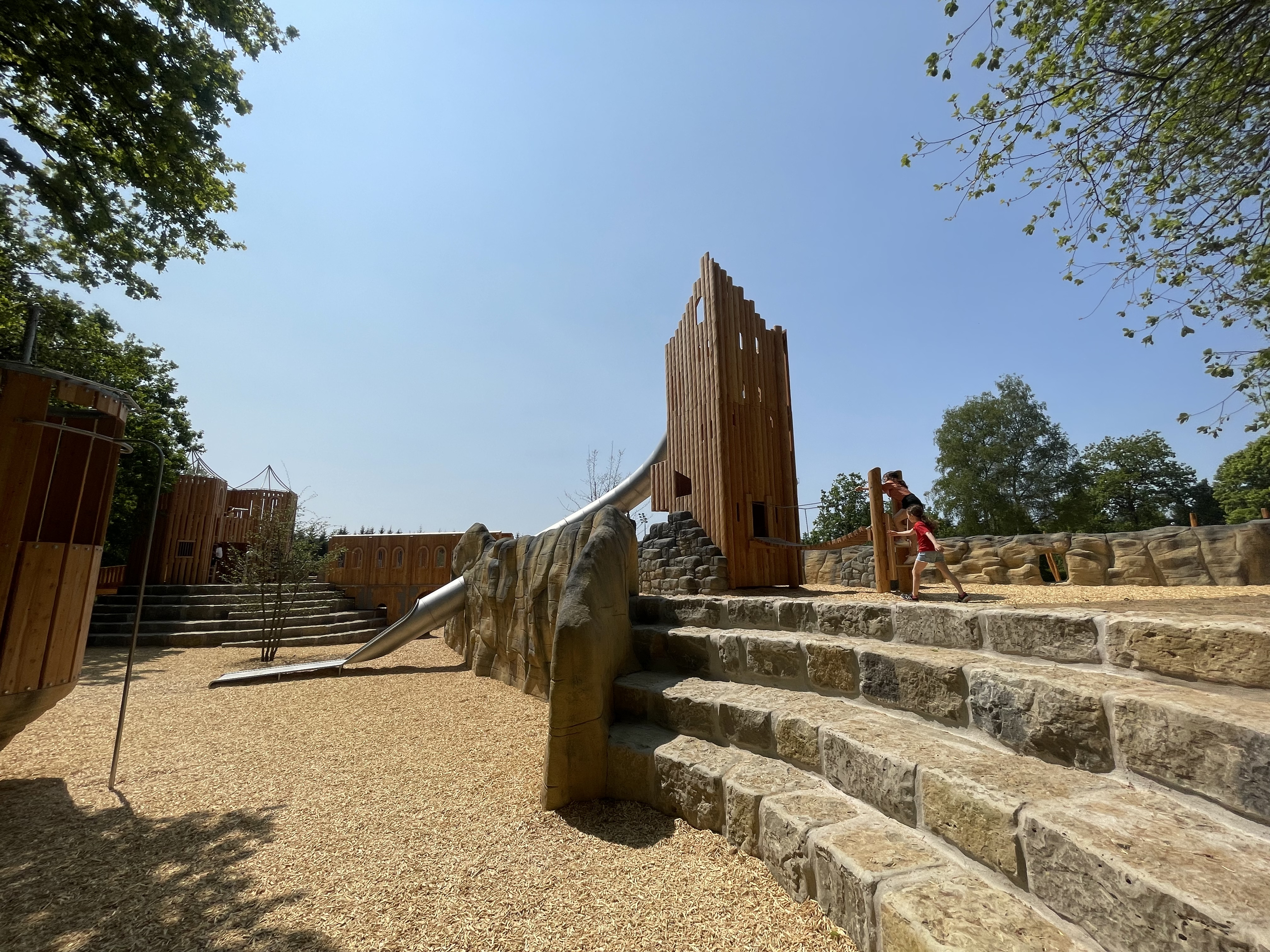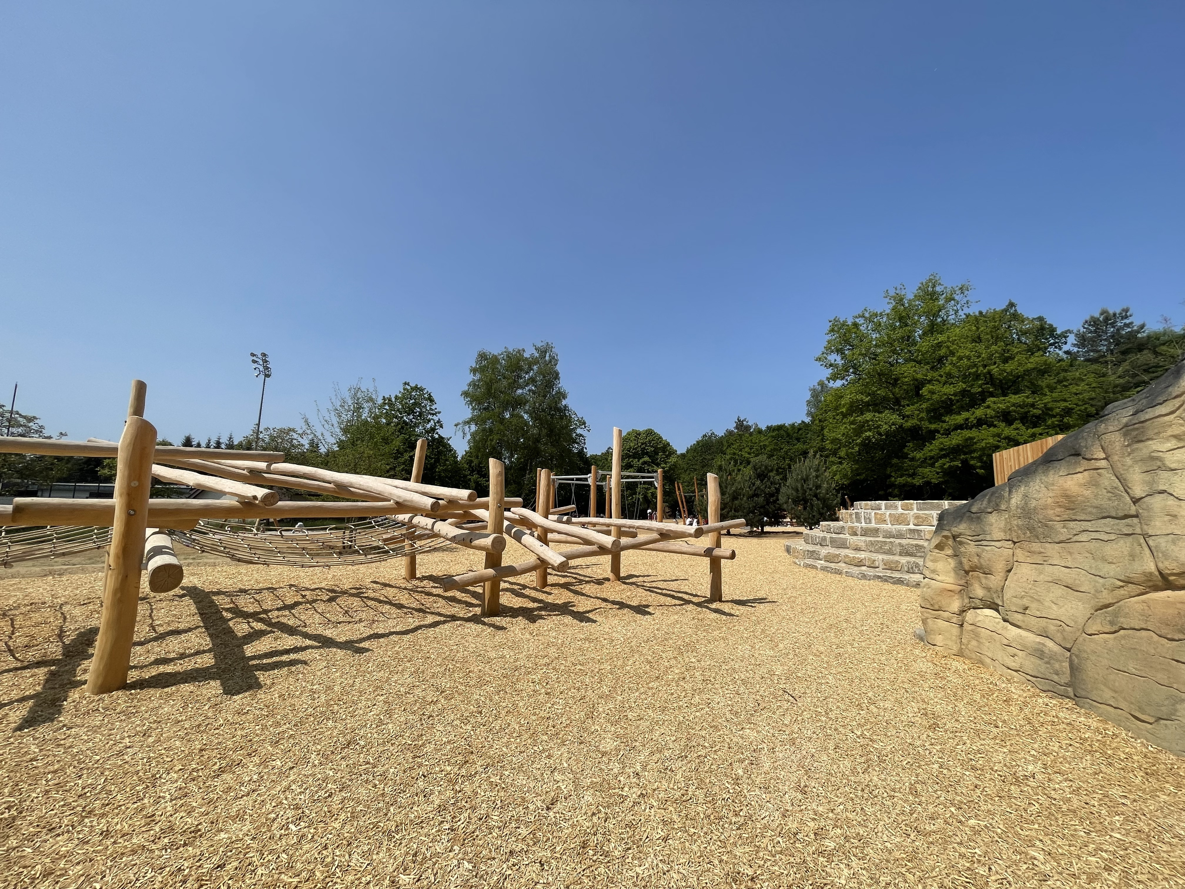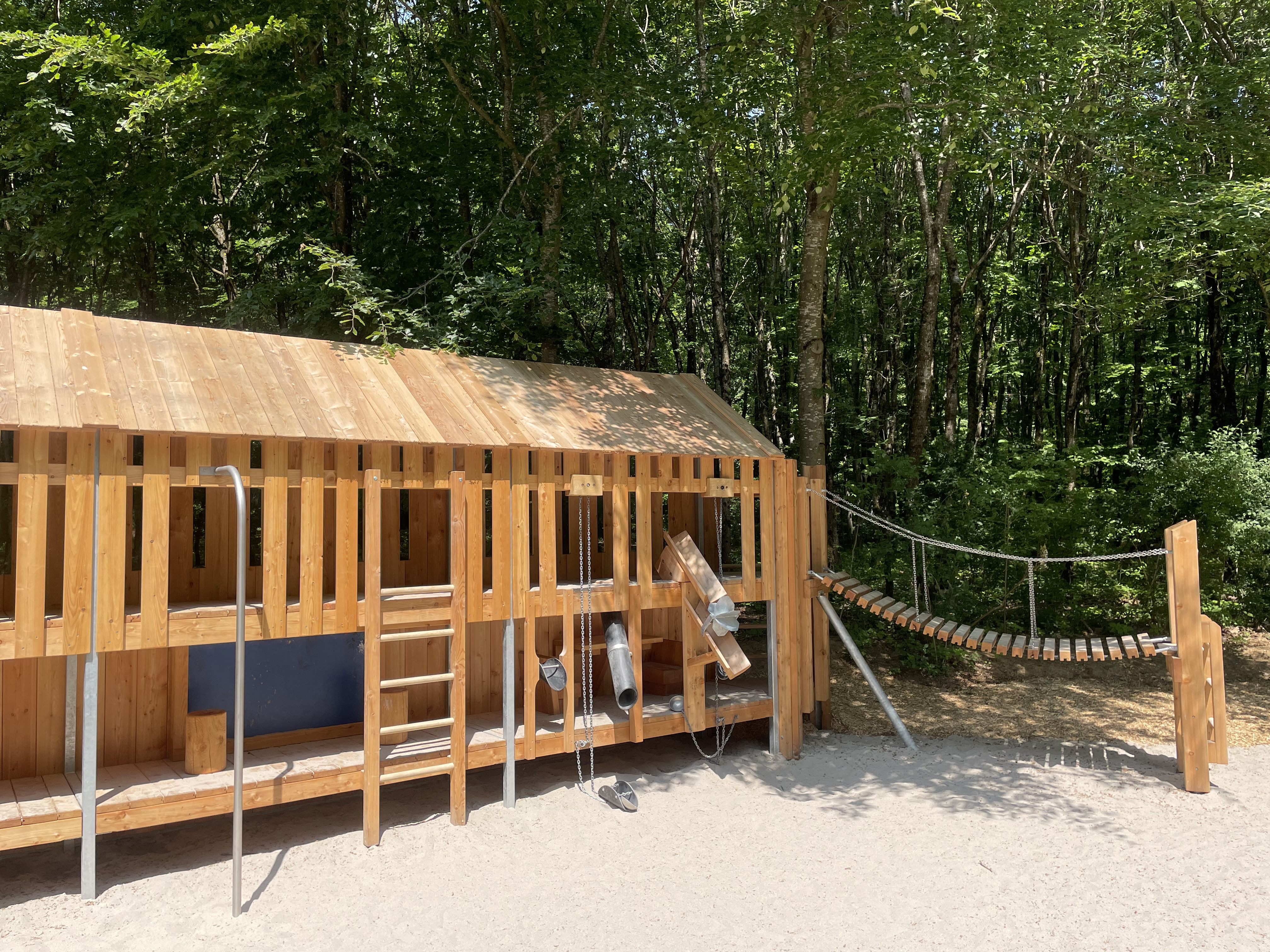 Aire jeux en forêt "Bambësch" dispose non seulement des toboggans, balançoires, bac à sable, parcours en bois, tyrolienne, mur d'escalade et aire de jeux d'eau les plus incroyables, mais elle est également située dans un espace vert extraordinaire avec de grands arbres et une nature à couper le souffle.