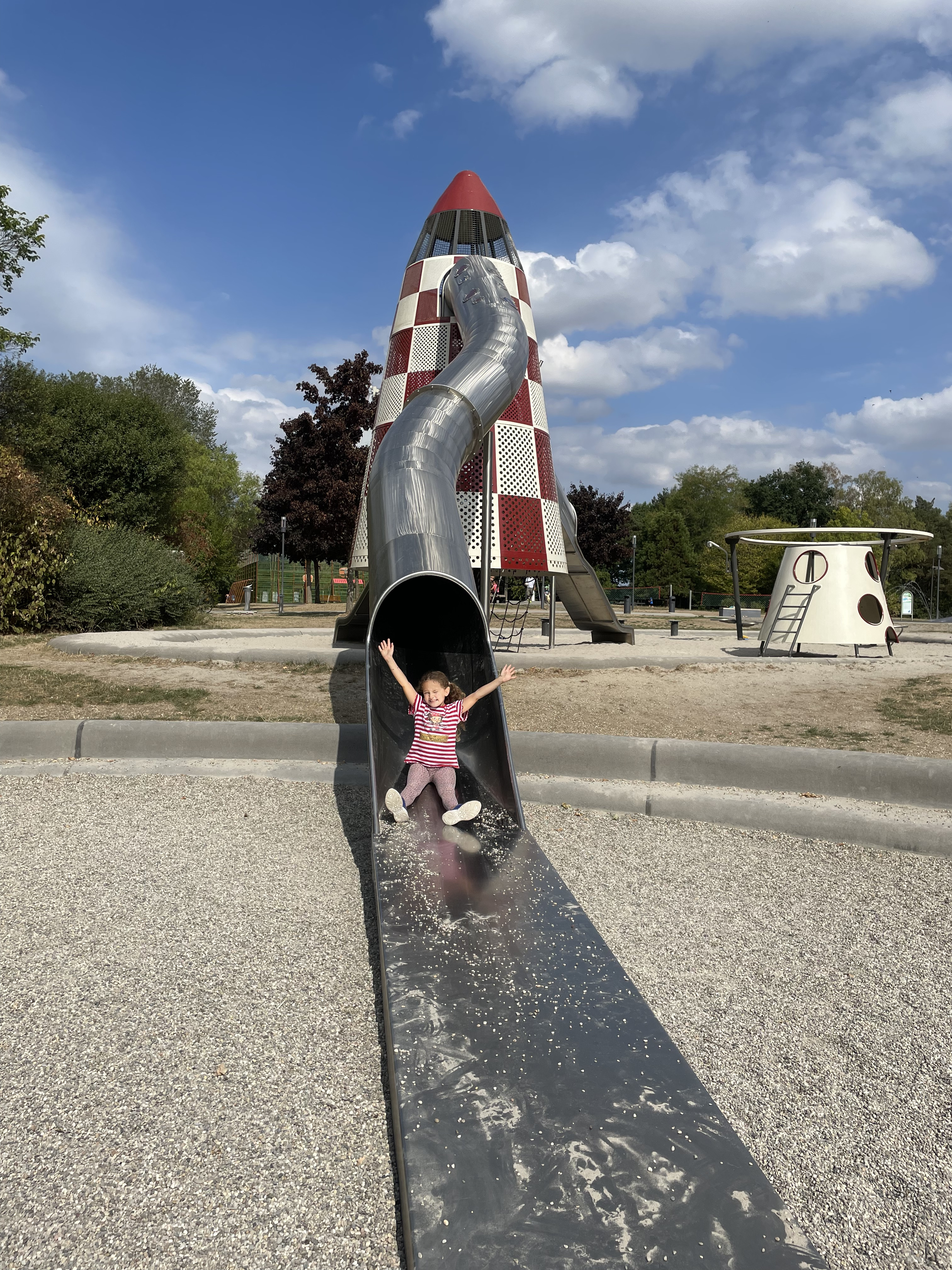 Avec ses jeux d'eau, sa salle de sport en plein air, son toboggan sur le thème de l'espace et son parking à proximité, cette aire de jeux est une valeur sûre. Une fois que les enfants auront découvert les jeux d’eau, ils ne voudront plus rentrer chez eux.