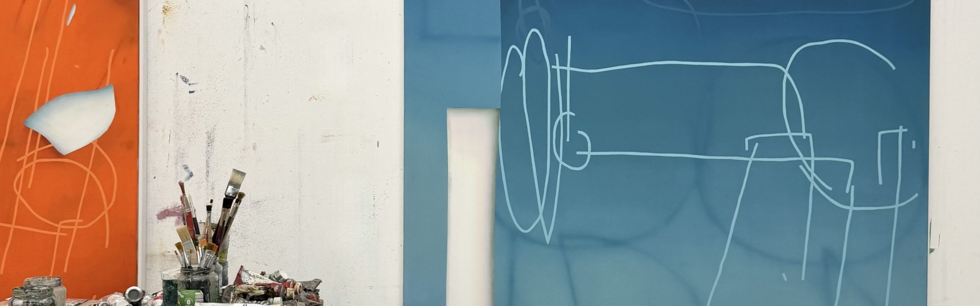 The painting series revealing seemingly cut-out shapes, explores space, composition, and color through dominant white forms set against colored canvases. These shapes suggest cut-out fragments, revealing layers behind and pointing beyond the painting itself toward the wall and exhibition space. The works treat painting as both illusion and object: not a surface carrying meaning, but meaning in itself. Depth emerges through breaks in form, line, and color, while contrasts - light and dark, warm and cool, soft and hard - define the surfaces. Soft, dissolving shapes are intersected by sharp, digital-like lines, introducing a dialogue between painting and contemporary screen-based imagery. These lines structure the compositions and guide the viewer’s perception.