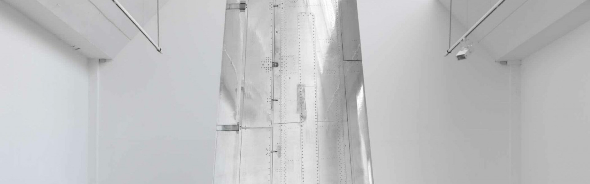 La sculpture monumentale Nude Wing (2011), qui a récemment intégré la Collection Mudam, s’inscrit dans une lignée d’œuvres de Fiona Banner aka The Vanity Press (1966, Merseyside), pour laquelle l’artiste anglaise s’approprie des avions militaires, ou des parties de ceux-ci, en les transformant. Issue d’un avion de combat Tornado, l’aile qui a été utilisée pour la création de Nude Wing a ainsi été polie, si bien que l’ensemble de sa surface, dans ses moindres détails, réfléchit désormais l’image de ce qui l’entoure – l’espace autant que les visiteurs. Elle est présentée verticalement, comme un monolithe se dressant vers le ciel. Dans le Grand Hall, la sculpture de six mètres de haut dialogue avec l’architecture de pierre et de verre de Ieoh Ming Pei et avec les variations de la lumière qui la baigne. À travers ces jeux de réflexions, elle se voit conférer une présence presque vivante, insaisissable, à l’image de l’ambivalence de l’expérience que nous pouvons en faire. « Le fait que nous trouvions ces avions beaux remet en question la notion même de beauté, mais aussi notre propre position intellectuelle et morale, indique l’artiste. Je m’intéresse à ce conflit entre ce que nous ressentons et ce que nous pensons. »