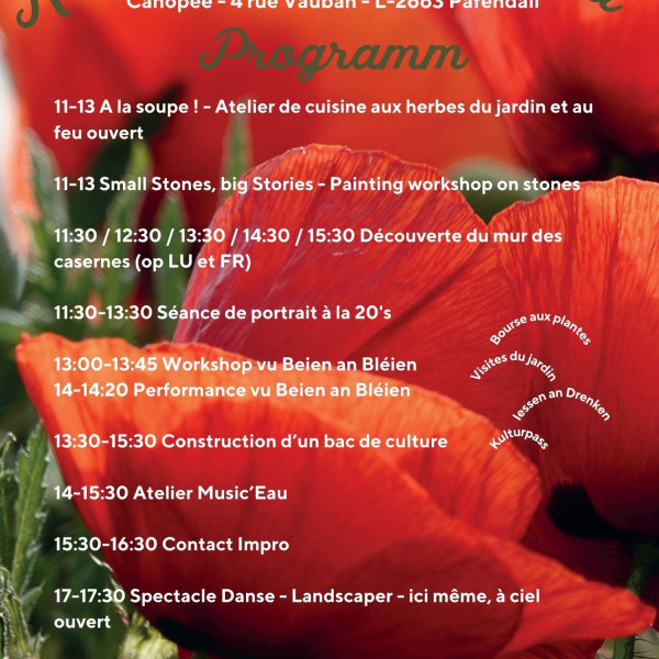 .Gratuit. Tout âge. Inscription nécessaire : https://canopee-asbl.com/07-06-25-rendez-vous-am-gaart-vun-canopee/