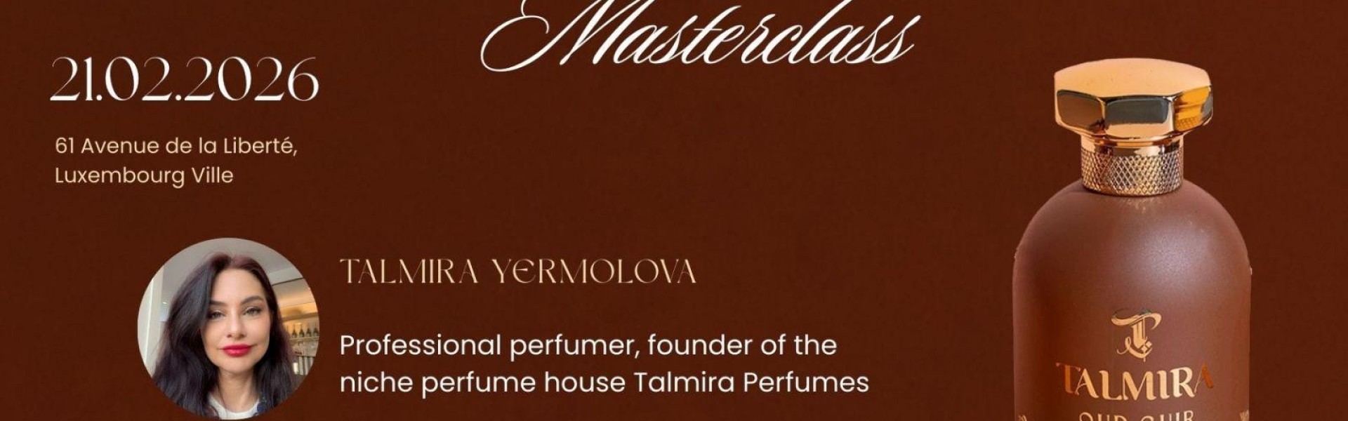 Cette expérience exclusive est organisée par Talmira Perfumes (marque Suisse) et sera animée par Talmira Yermolova — parfumeuse professionnelle, fondatrice de la maison de parfums de niche, formée à Grasse, France, capitale mondiale de la parfumerie.