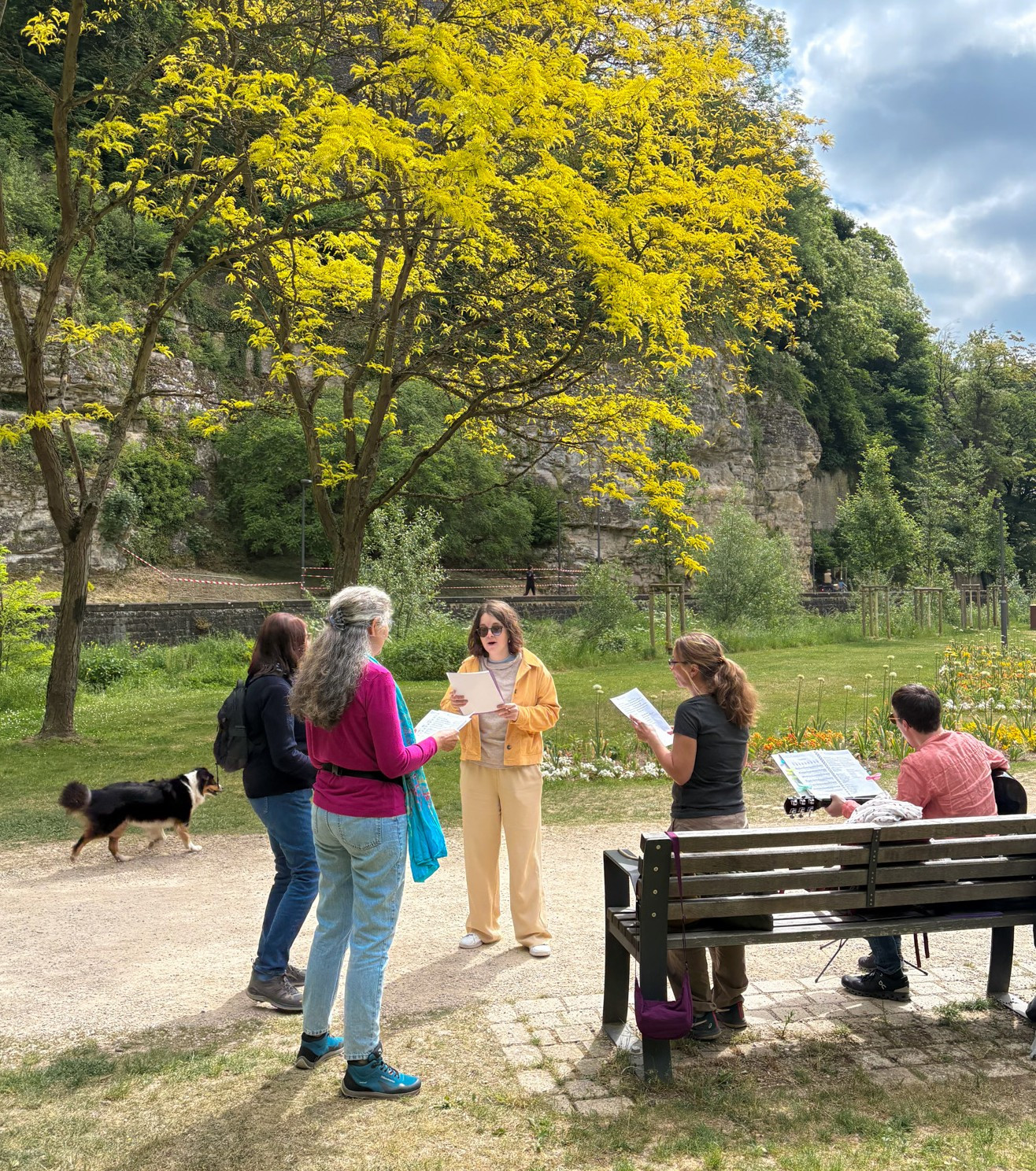 .Les animateurs d’ateliers de l’INECC, Tiffany Saska et Laurent Kohn, ont concocté un programme varié de chansons de toutes les époques et de styles différents, qu’ils répètent avec les participants. Outre le chant, l’expérience en plein air ne sera pas oubliée : le cours de deux heures sera consacré à la découverte de la nature de la Vallée de la Pétrusse.